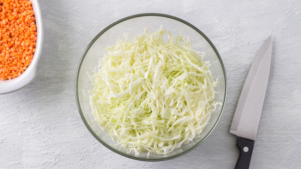 - Капусту тонко нашинкуйте, вырезав кочерыжку.