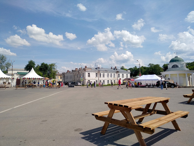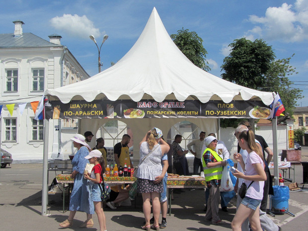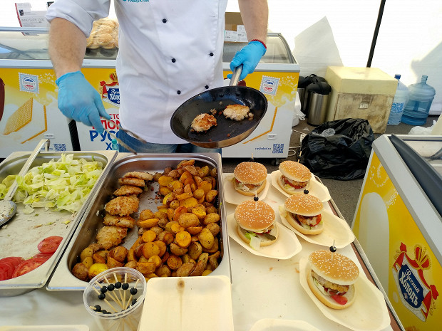 Отвечали мухоморы:/«Мы вить сами сенаторы,/Неповинны мы тому,/Нейдем на войну!/Прутка, нутка,/Прутка, нутка,/Прутка, нутка,/Ну, ну, ну!/Прутка, нутка,/Прутка, нутка,/Прутка, нутка,/Сердце мое». На сцене, установленной посреди площади 9 Января, главной площади Торжка, сидит красивый мужчина с гуслями. Вокруг сцены стоят люди в поварских кителях, телевизионщики, владимирский повар Максим Рыбаков, историки русской кухни Ольга и Павел Сюткины и организаторы фестиваля «У Пожарского в Торжке». На площади расставлены деревянные столы, за ними сидят люди, в большинстве своем в одинаковых футболках с фестивальной символикой, и едят румяные котлеты разных форм и размеров. По периметру площади сооружены торговые ряды, на прилавках которых лежат опять же горы котлет.