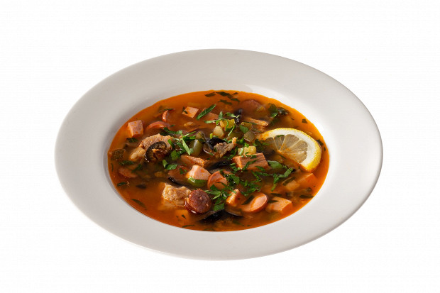 По народным традициям в порядочной солянке должно быть не меньше 5 видов мяса, вернее — мясных изделий. Исчерпав набор из говядины, языка, копченостей и шпикачек, мы неминуемо обращаем взор на докторскую колбасу, именно по причине того, что фарш в ней монолитен, ведь если в куске колбасы встречаются жировые вкрапления, то в рыжей солянке она выглядит не так привлекательно. Ну и весь этот хор мясных деликатесов не заглушит отдельных исполнителей: докторская тут не самый главный ингредиент, но чем она будет вкуснее и дороже, тем вкуснее получится и солянка.