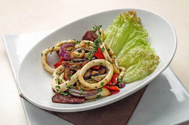 Сложносочиненный салат, в котором участвуют наравне с телячьим языком кольца кальмара, картофель, зеленый горошек и чернослив. Сочетание языка с черносливом очень удачное, его можно смело использовать в разнообразных рагу и тушеных блюдах, а соус из сметаны с уксусом и рубленым яйцом прекрасно аккомпанирует не только мясу, но и рыбе.