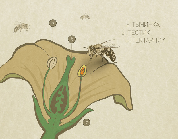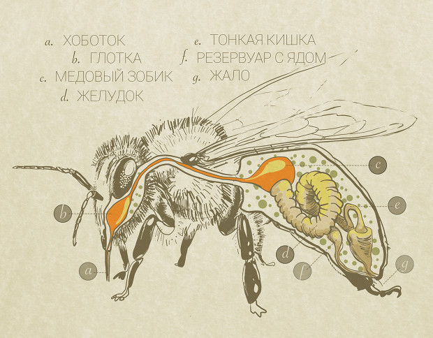 У пчел интересно (впрочем, у кого не интересно) устроена пищеварительная система. Важнейший ее орган — медовый зобик, хранилище и место первичной переработки нектара, который пчела собирает хоботком. От средней кишки зобик отделен специальным клапаном, так что в нее нектар поступает только тогда, когда пчела проголодается, и в ограниченном количестве. Таким образом, основную часть добычи насекомое доносит до сот, где срыгивает ее в ячейки.
