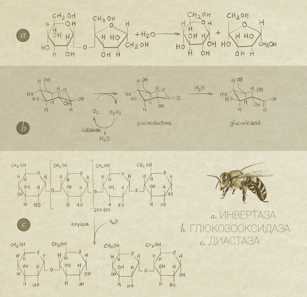 Глюкозооксидаза способствует расщеплению глюкозы на глюконовую кислоту (из всех органических кислот она больше всего влияет на вкус меда) и перекись водорода. Перекись водорода нестабильна и разрушается впоследствии, но в начале процесса защищает мед от микроорганизмов.