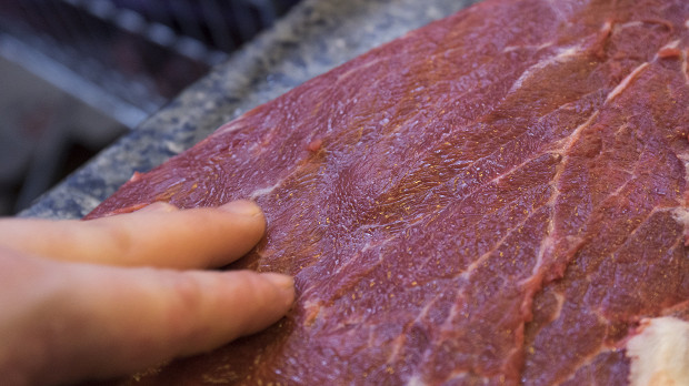 Во-вторых, мясо надо внимательно осмотреть. Ориентироваться по цвету можно, но не всегда угадаешь. Оттенки бывают разные — от кроваво-красного до розово-красного. Цвет зависит от того, вызревшая это говядина или нет, молодая она или постарше, а иногда — от породы и от откорма. Но все же есть несколько стопроцентных правил. У вызревшей говядины, например, ярко-красный цвет. Это потому, что из мяса выходит влага и в нем, грубо говоря, все мясное становится более концентрированным. Еще важный показатель — старое мясо всегда будет яркого темно-красного цвета. Еще о внешнем виде: на мясе не может быть кровавых подтеков и гематом, которые возникают от неправильного забоя. И оно, естественно, не должно быть заветренным.
