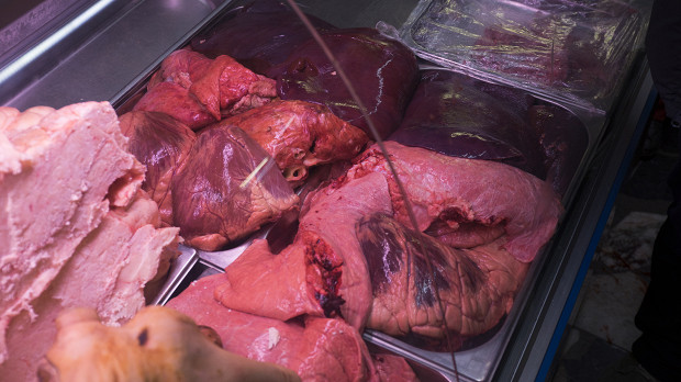 При выборе легкого надо вглядеться в его окраску. Оно должно быть бледно-розовое с кровавыми капиллярами и упругое на ощупь.