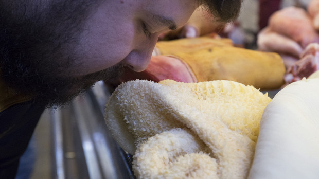 Во-первых, его надо нюхать. Говядина должна иметь приятный молочный аромат. Испорченное мясо пахнет невкусно. Но часто продают старое мясо — не испорченное, просто мясо старых животных, — которое пахнет коровником. Вот этого коровника тоже быть не должно.