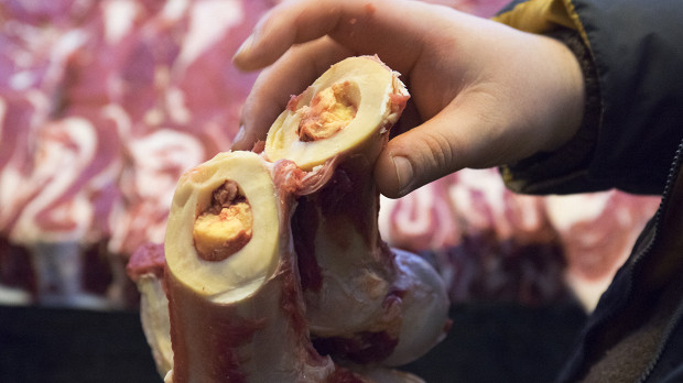 В туше быстрее всего начинают портиться кости, так что они должны быть максимально свежими. Для бульонов идеально подходит большая кость, которую повара называют гантелью. Ее обязательно надо разрубить, чтобы во время варки из нее вышел костный мозг, который сделает бульон насыщеннее. Конечные части кости, то есть колени, называются мотолыжками. Их тоже надо распилить на четыре части, чтобы мозг вышел наружу. Варить такую кость надо долго, часов шесть. После того как мясник распилит кость, посмотрите на спил — мозг должен быть мокрым, чуть-чуть может выступать кровь, цвета он должен быть желтого или белого. Еще такую косточку можно попросить распилить на шайбы — их хорошо запекать с петрушкой и чесноком.