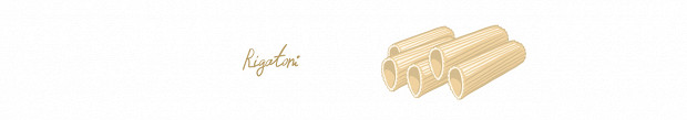 Короткая паста в виде рифленых трубочек, более массивная и грубая, чем пенне и зити, но и не такая огромная, как каннеллони. В наши дни очень популярна в регионе Лацио и на Сицилии. Хорошо сочетается с густыми соусами с кусочками мяса — например, с аматричаной из Лацио (в нее входят гуанчиале, томаты и пекорино). Старинный римский рецепт — ригатони кон ла паята; правда, такое блюдо не каждый осилит, потому что соус паята готовят из застывшего молока, содержащегося в желудках и кишечнике молочных телят.