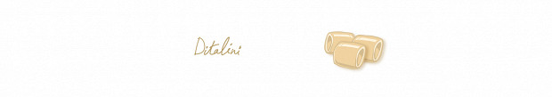 Рифленые микротрубочки длиной около 4 мм и такого же диаметра. Паста в основном для супов с густой консистенцией (но не для супов-пюре). Самое примечательное в ней — название. «Дита» переводится как «палец», а «диталини» — это наперстки, паста по форме и правда на них похожа. А еще «диталини» — это «игра с пальцем», то есть когда женщина доставляет себе удовольствие. Вот такая игра слов! Популярны диталини в южных регионах: в Кампании, Калабрии и на Сицилии.