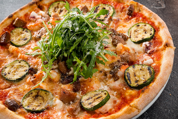 «Пицца эта называется «Море и горы», и ингредиенты в ней подобраны соответствующие: морепродукты — и белые грибы и цукини, растущие на суше. В принципе, вместо цукини там мог быть какой-нибудь другой овощ, например, зеленый горошек. «Море и горы» — распространенное для Италии название пиццы, только она везде по-разному готовится, но главное в ней — баланс морепродуктов (тут могут быть и вонголе, и мидии, и креветки) и овощей. Важно уметь сочетать несочетаемое, смешать в пицце такие ингредиенты, которые обычно не кладут на тарелку вместе. Сначала мы пытались сделать эту пиццу посложнее, и помимо белых на ней побывали другие лесные грибы. Но потом решили не мудрить и оставили только белые, их в замороженном виде можно спокойно купить круглый год».