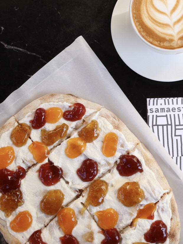 «В Риме делают пинсу с рикоттой, медом и свежим инжиром. И мы с партнерами решили, что у нас десертный вариант пинсы тоже обязательно должен быть. А для того чтобы гости могли позволить себе заказать ее после обеда (пинсы или, например, салата), то стоимость блюда не должна превышать 250 рублей. Такую цену в Москве сложно было бы держать, если бы мы использовали свежие фрукты. Кроме того, не всегда можно купить фрукты должного качества и вкуса. Поэтому мы используем джемы: клубничный, абрикосовый и инжирный. В Италии много десертов с рикоттой. В отличие от жирного маскарпоне или других сливочных сыров, которые могли бы являться основой сладкой пинсы, рикотта — легкая и с джемами отлично сочетается».
