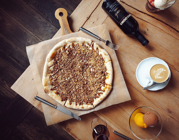 «Тут все очень просто: в Италии между обедом и ужином принято утолять голод либо каким-то фруктом, либо кусочками хлеба с нутеллой — быстро и вкусно. Поэтому мы решили, вспомнив об этой замечательной привычке, сделать такую пиццу. Еще мы добавляем фундук, он тут смотрится органично, потому что нутелла как раз из фундука и сделана. В этой пицце хорошо сочетаются разные текстуры: нутелла мягкая, фундук хрустит на зубах. Еще мы добавляем совсем немного сыра маскарпоне, чтобы он смягчал вкус ореховой пасты и делал ее еще нежнее».
