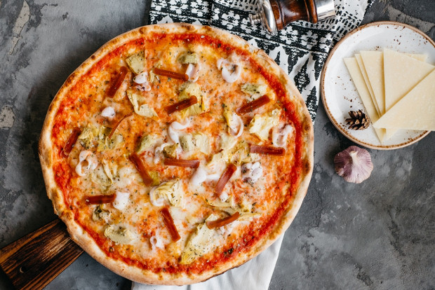 Пицца с кальмарами, маринованными артишоками и боттаргой