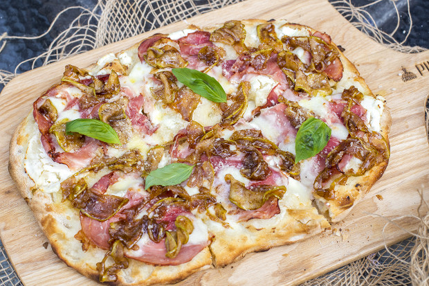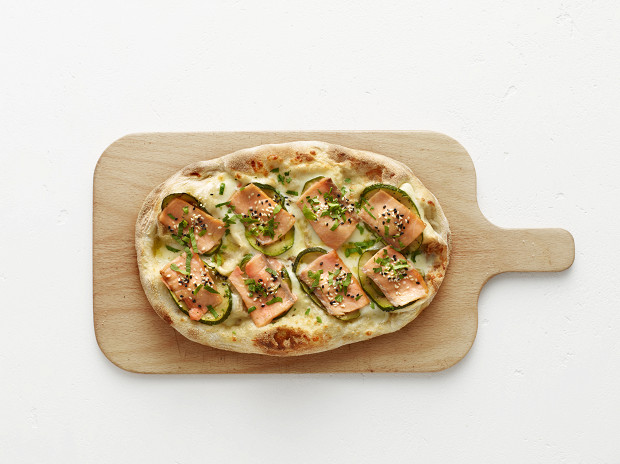 «Пинца — такая вещь, туда можно положить все что хочешь. Эту мы придумали после введения санкций: нам нужны были продукты, которые легко найти. Сначала в этом рецепте появилась подкопченная форель, которая потом заменилась подкопченным лососем. Копченая рыба смягчается цукини, приготовленным на гриле. Кусочки рыбы выложены на ломтики цукини, а сверху посыпаны кунжутом — обычным или черным. В такую пинцу можно добавить также жареный красный лук, укроп, сметану — тоже будет хорошо».