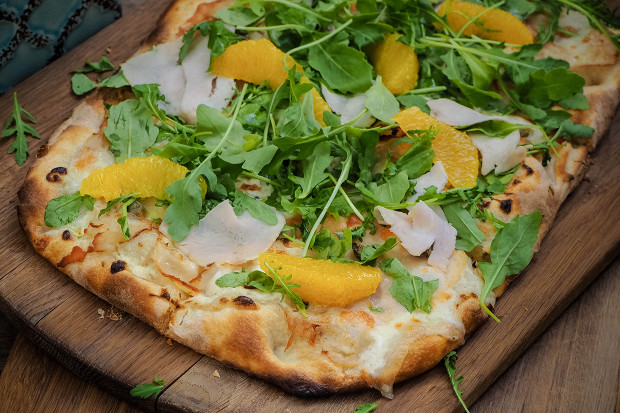 «Мы эту пиццу задумывали как пиццу с вителло-тоннато, только чуть иначе поданное. Так что основа для пиццы тут выступает как хлебная тарелка, на которой слегка видоизмененное вителло-тоннато и разместилось. Телятину мы решили поменять на индейку, так начинка получается легче и нежнее, и с тунцовым соусом индейка сочетается не хуже. Вообще, это такой соус, который отлично сочетается даже с курицей. У пиццы довольно яркий вкус: соленый тунцовый соус, кислые каперсы, сливочная моцарелла, пряная руккола и кусочки апельсина; тут и соленое, и кислое, и сладкое, и легкая горчинка. Поначалу мы пытались вместо апельсина положить сюда ананас, запеченный на гриле, но апельсин складывается с соусом тоньше».