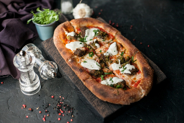 «Мы эту пиццу придумали пару лет назад, когда фалафель и здоровое питание были на пике моды. А мы как раз тогда хотели сделать полезную, здоровую пиццу, не похожую на другие. Фалафель с соусом из йогурта и мяты мы в ресторане и так делаем, поэтому изобретать его заново нам не пришлось — в пиццу кладем точно такой же. Его сухость и резковатый вкус смягчает тахинная паста, которая часто соседствует с фалафелем в разных блюдах, а также два сыра — моцарелла и сулугуни. Можно было бы обойтись одной моцареллой, но тогда бы мы никого не удивили. А сулугуни придает моцарелле некоторую пикантность, при этом вкус его вы в этой пицце не узнаете, он преобразуется в нечто другое. Все это в конце перед подачей мы украшаем кинзой и сумахом, и можно посмотреть на это блюдо так: это фалафель с привычным набором дополнений к нему, просто иначе поданный».