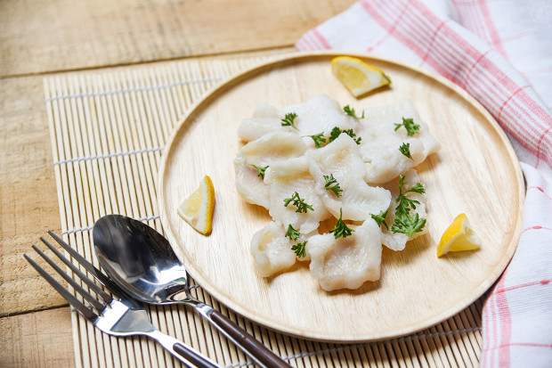 - Цвет филе должен быть равномерным, белым. Допускается серый оттенок мякоти, но чем он более выраженный, тем ниже качество рыбы. Розового или желтого оттенка быть не должно — это показатель того, что рыбу или некачественно кормили, или химически обрабатывали перед заморозкой.