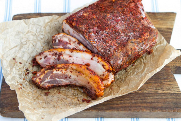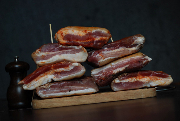 Мы в ресторане так и делаем. Берем грудинку с мясными прослойками. Надрезаем ее по длине кусками 3–4 сантиметра. Обильно солим крупной солью, включая корочку и разрезы. Обмазываем сало сухим чесноком, орегано, можжевельником, сухими укропом и петрушкой. Пропорции специй — на глаз, главное, чтобы густо обмазать. Кладем это сало в кастрюлю, накрываем тарелкой или чем-то круглым, чтобы сверху можно было установить гнет, и в таком виде выдерживаем в холодильнике или в просто прохладном месте три-четыре дня. Потом соскабливаем соль и специи, выкладываем сало на решетку и коптим на черемуховых гнилушках. Затем, если захочется, сало можно натереть смесью паприки и острого перца. Можно поедать его и в горячем, и в холодном виде.