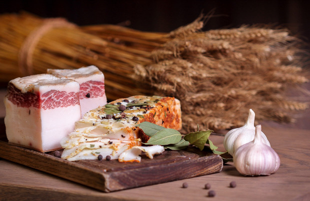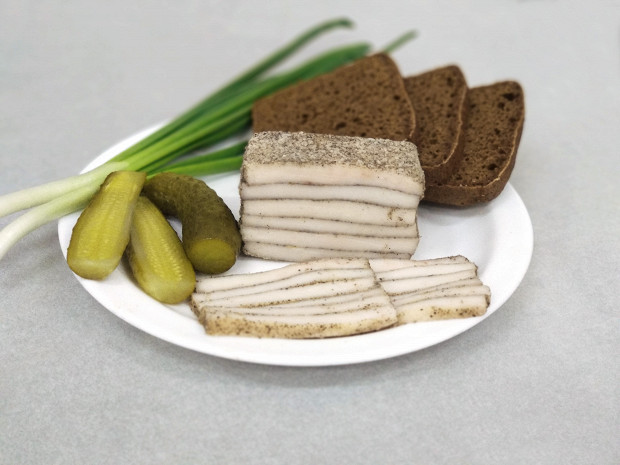 «Когда выбираете сало, надо смотреть на его состояние и структуру: чтобы оно не было скользким, чтобы мясные прожилки были розового цвета, ни в коем случае не коричневыми. Толщина особой роли не играет, но идеальная — 5 см. Можно и поменьше, тогда его будет проще резать.