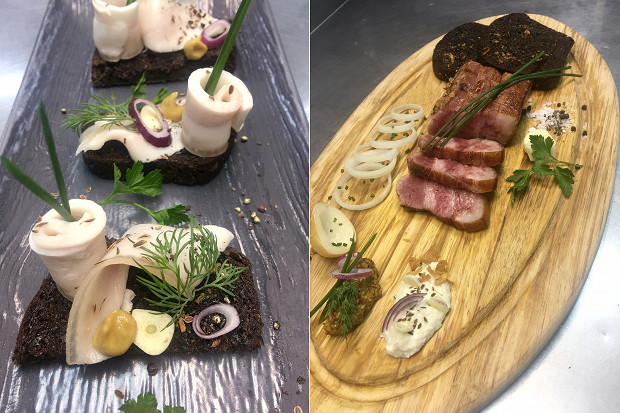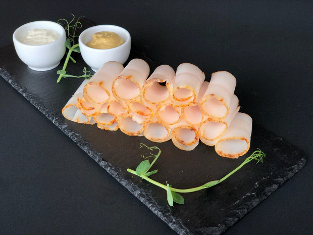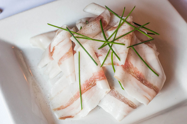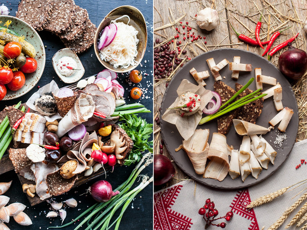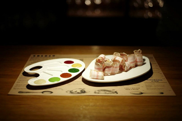Когда сало проморозится, поступаем с ним так: придаем ему максимально плоскую форму и слайсером безжалостно снимаем всю шкурку (к сожалению, многие наши гости ее не едят). Потом нарезаем опять же на слайсере тонкие кусочки сала, сворачиваем их в полые трубочки, намотав на палец, и снова замораживаем. В таком виде и храним сало в морозилке — а когда надо его подавать на стол, мы кладем на тарелку 12 трубочек и к ним подаем соус. Я купил в канцелярском магазине детскую пластиковую палитру, отдал ее керамистам, и нам сделали такие же из керамики. В ней шесть углублений для красок, в каждую мы добавляем по соусу — чесночный копченый, соус барбекю, аджику, горчицу, хрен со свеклой и васаби. По цвету это белый, коричневый, красный, желтый, фиолетовый и зеленый».
