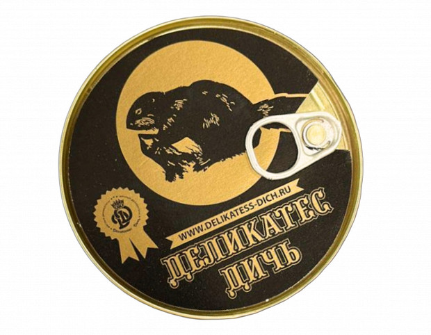 Консервная банка — как у шпротов, только повыше, с бобром на картинке и парадным черно-золотым оформлением. Внутри добротная порция мяса, приправленная луком, перцем и лавровым листом.