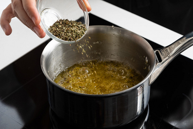 «Если вам хочется сделать вкус топленого масла еще ярче, то смело добавляйте в него какие-нибудь сушеные травки или специи. На 100 грамм масла около 10 грамм добавки. Добавлять надо где-то в середине растопки, когда масло уже разъединилось на фракции, когда белый осадок уже снят и в кастрюле остался чистый жир — ему-то и суждено соединяться с ароматами. Добавки могут быть разными — от кориандра и тимьяна до корицы и сушеного имбиря, такое масло, кстати, будет уместно в выпечке. Лично я бы кинул чеснок, розмарин, тимьян, орегано, зиру, кориандр — все работает».