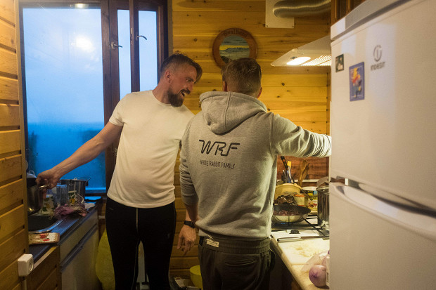 Мы выпиваем за здоровье Артема Лосева, сегодня он именинник. Самого Лосева нет, он пошел проверять оленя на улицу, именно он в том казане на огне. Оказывается, что и готовить сегодня — его очередь. Затем он уходит в баню, и вахту подхватывают Шмаков, Троян и Гришечкин. Каждый добавляет оленю а-ля биф бургиньон (то есть томленому в красном вине) свой штрих, так что чье блюдо мы будем есть на ужин — непонятно. «А если олень не получится, скажем, что Олег готовил», — смеется Шмаков.