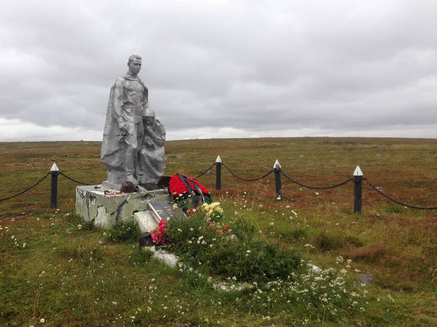 Еще через полчаса мы поднимаемся на сопку Переметная, к мемориалу защитникам полуострова. Не думая о дожде, снимаем шлемы, подходим и молча стоим пару минут. Подножие памятника укрыто искусственными цветами, их неестественно насыщенные оттенки дисгармонируют с монотонным серо-болотным пейзажем. Шмаков поправляет ленту на венке, так, чтобы красная лента с золотой прописью «Защитникам отечества» легла поверх изумрудных пластиковых иголок.