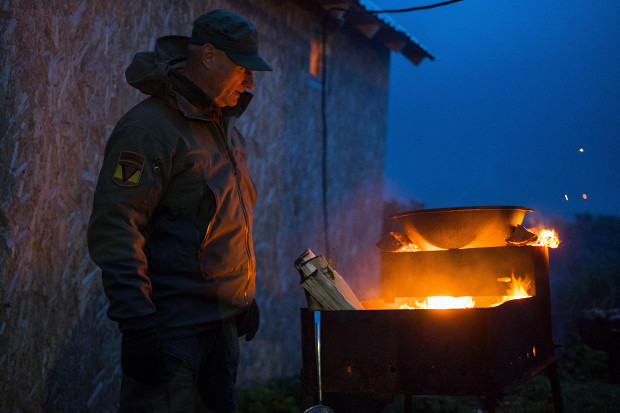 Первой на столе появляется закуска, презентует ее Троян, а потому все благодарности дюжины голодных ртов достаются ему, хотя он всего лишь открыл шпроты и нарезал сало. Каменев разливает водку — вечер пущен. Выхожу подышать на улицу — около бани на мангале стоит казан. Олег Гегельский подкладывает в костер сухие дрова.