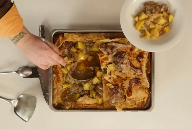 Название переводится как «большой пирог», но, строго говоря, это не пирог вовсе, а сытное жаркое в тесте. Наш вариант с уткой, но внутри могут оказаться и говядина, и баранина.