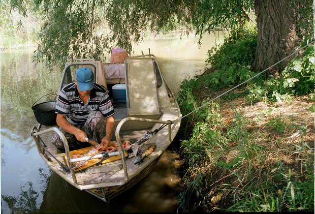 «Что делать с рыбой, которую сегодня поймали?» — доносится из кухни девичий голос. Тучный седовласый мужчина несколько секунд смотрит перед собой. Он сидит за столом, каждый миллиметр которого уставлен тарелками. Манты с сазаном, сазан, запеченный в горшке под тестом, люля-кебаб из сазана, пирог рыбный, жареная вобла, форшмак, жареные пельмени с судаком, уха из трех видов рыб, котлетки из окуня, щука фаршированная, вымоченный в молоке и зажаренный судак, балык из сома, салат с кишками осетров. «Хе сделаем и фаршированную щуку в яблоках, печень щучью в сметане пусть потушат и икру пожарят. Остальное — закоптите, — крикнул он через секунду и, расплывшись в улыбке, обратился уже к нам: — Все это по местным рецептам, половину сами придумали, остальное собрали по старикам».