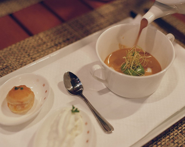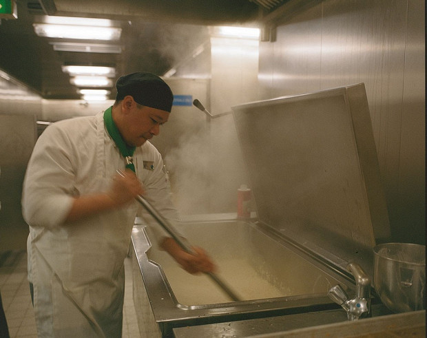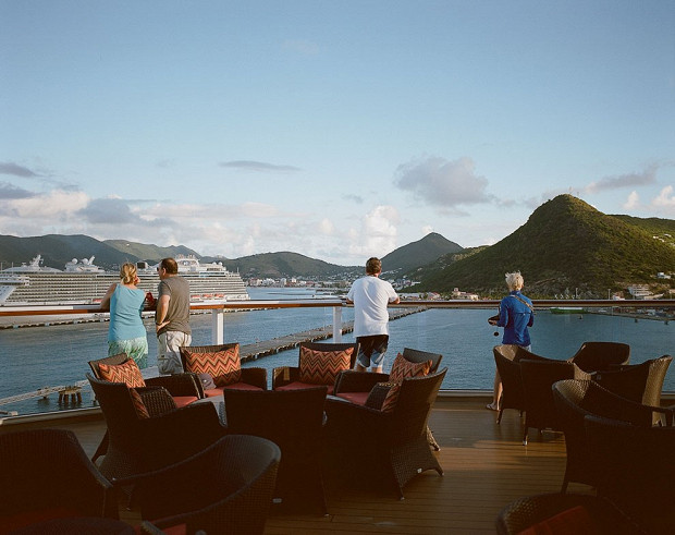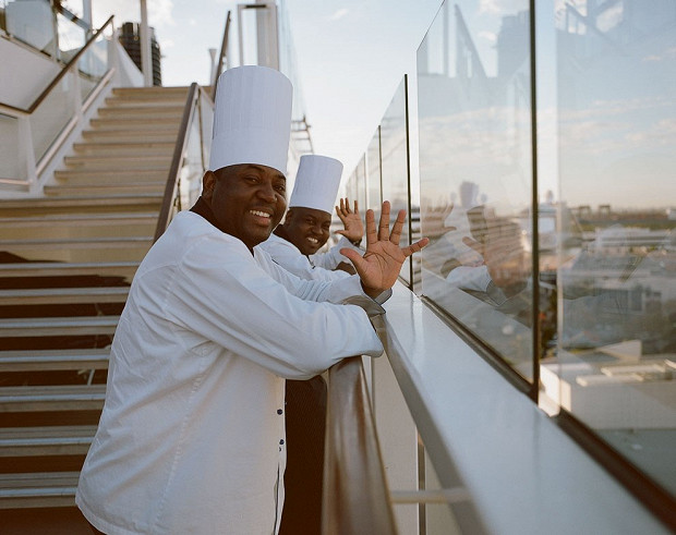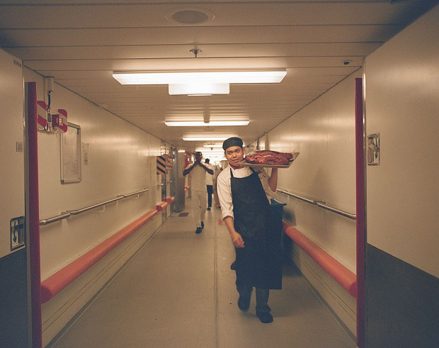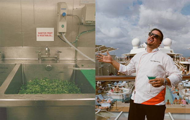Пару дней назад мы отплыли из Майами и движемся в сторону Карибских островов. После коротких, не более чем на день, остановок в Пуэрто-Рико и на острове Святого Мартина мы развернемся обратно. Всего семь дней. Полные пять из них проходят в открытом море. В эти-то дни корабль и развлекает гостей изо всех сил и всем тем, что имеет. И главная в этой программе, конечно, еда. А главный — шеф-повар, которого я и пытаюсь выловить в бассейне. Первое блюдо приготовили на корабле Celebrity Silhouette пять лет назад. Построенный за полтора года в Германии, высотой в четырнадцать этажей, он входит в пятерку самых крупных в мире и вмещает две с половиной тысячи гостей и столько же членов команды (то есть на каждого гостя приходится по одному служащему на корабле). Его планирование началось задолго до этого, в конце 90-х, что выдает в деталях слегка устаревшее представление о роскоши: плавучий атриум с грандиозными люстрами и бордовыми коврами недалеко ушел от эстетики «Титаника». Зато еда тут не устаревает — ее постоянно обновляют в соответствии с духом времени. Скоро, говорят, на корабле начнут действовать даже поп-ап-рестораны. Сейчас на судне одиннадцать мест, где можно поесть. Не считая закутка на верхней палубе, где отдают в неограниченном количестве хот-доги и бургеры (пока стоишь в очереди, уже обгораешь), и автоматов с мороженым. А также тех заведений для VIP-гостей, которые я видела только в замочную скважину (сидят бизнесмены с сигарами). Гордость департамента еды — концептуальные рестораны. Их в сумме пять, и расположены они все на пятой палубе. Tuscan Grille — итальянский стейк-хаус в помещении с доминирующими красными и деревянными поверхностями. Blu с холодными абстрактными паттернами и со здоровым меню (стейк принесут, но с соусом винегрет вместо беарнского). Bistro on Five с открытой кухней, где готовят блинчики креп-сюзетт. Qsine, меню которого загружено в iPad, — кухни разных стран мира, упакованные в мини-сеты на компанию. И Murano, который тут называют «наш мишленовский ресторан», потому что Michelin однажды обмолвились, что и рады бы дать звезд Murano, но не могут: по правилам у ресторана должен быть физический адрес. Однажды на кухне Murano я даже застала учеников кулинарной школы, которую открывают на время круиза. В целом такие рестораны, как эти, смотрелись бы гармонично и в пяти минутах от Кремля. Но чаще и больше всего на корабле едят в двух местах. Первое — для завтраков и обедов — буфет Ocean View. В нем не одна «линия» с едой, как это бывает в столовых, а восемь «островков»: простые и сытные блюда типа паст и рагу, различные мясные, что называется, нарезки, десятки видов хлеба, свежие фрукты и овощи — в общем, без специальных ухищрений. Все очень вкусно, и все невозможно попробовать даже за семь дней пути. Второе место — двухэтажный ресторан-гигант Grand Cuvee на 1700 человек, стержнем которого выступает прозрачная конструкция с тремя тысячами бутылок различного вина внутри (на борту, кстати, двадцать сомелье и несколько баров, включая бар с молекулярной кухней). Автор интерьера описывает его так: «Я хотел, чтобы это место было похоже на бокал с шампанским». И действительно, ежевечерние ужины здесь проходят каждый раз в крайне торжественной обстановке. Меню разделено на две части: слева классические блюда (то есть французская кухня); справа — экспериментальные, которые меняют каждый 