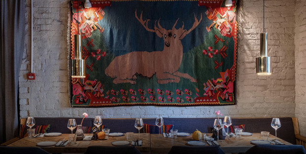 В меню мезе с пышной питой, тонкие полумесяцы-кутабы, хинкали, долма по семейному рецепту шеф-повара Михаила Аракелова (в фарш добавляют немного коньяка), хаш и ассорти мцвади (хиты меню — шашлык из осетрины и из дагестанского барашка). Шеф привозил из Армении шелковицу и ежемалину и с ними подает сезонные тарты. К блюдам сварят кофе на песке, предложат гранатовую настойку на чаче и откроют грузинское вино.