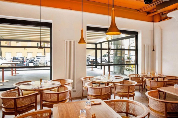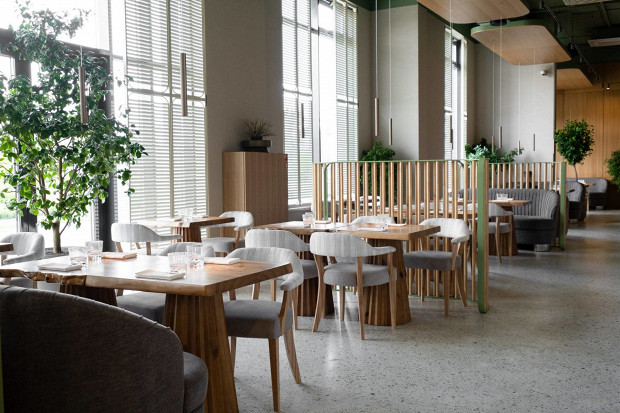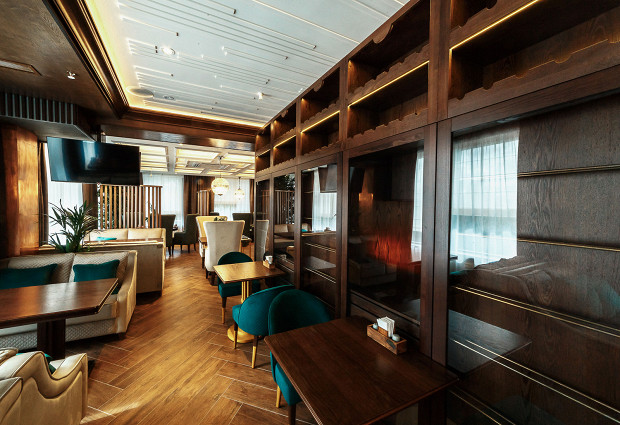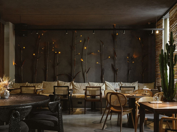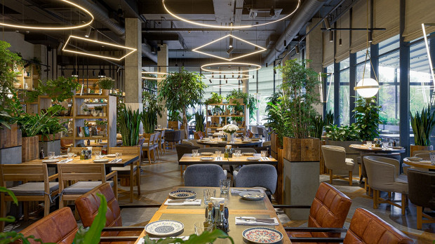 Современный ресторан с большими панорамными окнами с видом на набережную и красивым ботаническим барельефом на стене. В меню от шеф-повара Виталия Ущаповского: крудо из гребешков с яблочным айоли, паштет из печени цыпленка с желе из просекко, хрустящий баклажан с камамбером и мачете с виноградом и соусом из фуа-гра. Все блюда легкие, шеф мастерски работает с овощами. В будни днем здесь готовят нескучные обеды, а на мероприятие можно заказать камерный ужин в формате chef’s table за большим столом напротив открытой кухни.