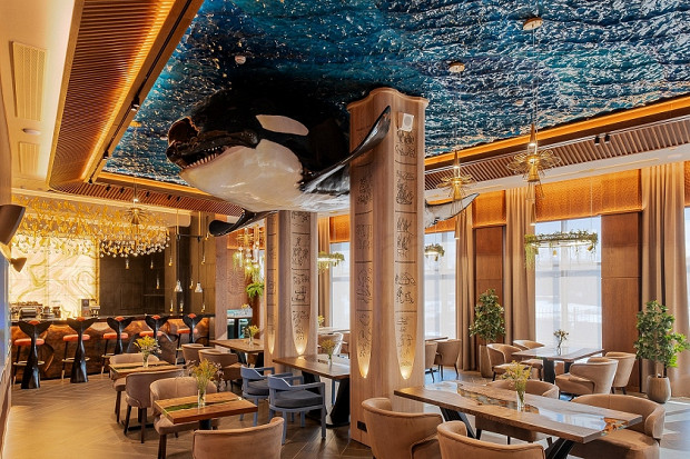 Очень красивый атмосферный ресторан при отеле «Территория». Интерьер стилизован под дно Охотского моря: полноразмерная косатка под потолком, косяки рыб кружатся над столами, а на входе встречает чучело медведя. Возможно, это будет единственный медведь, которого вы встретите в Магадане. Вопреки мифам, они не ходят по улицам.