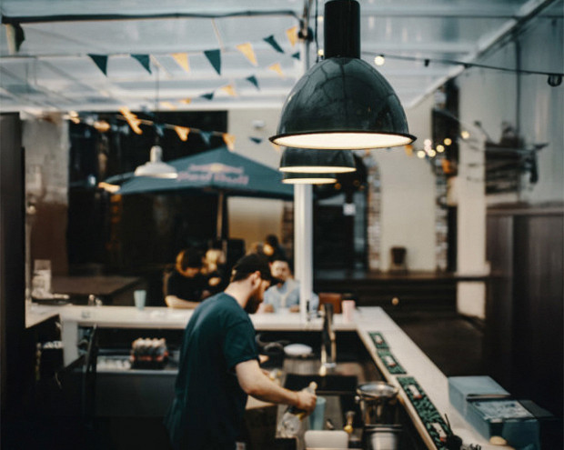 Здесь все большое: огромный зал, огромная открытая кухня, где есть и традиционная печка, и гриль, и смокер. Ассоциации с заводом усиливают и начертанные на стенах чертежи гигантских механизмов, и гигантские цифры. Совершенно неудивительно, что «Горячий цех» занимает помещение старого советского кинотеатра.