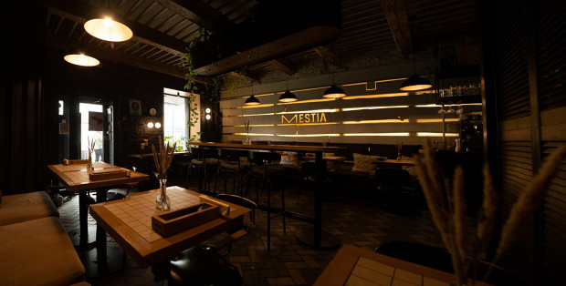 Гастробар Mestia расположен на единственной в Тюмени пешеходной улице. Вывеска совсем крохотная, так что ориентироваться можно на зеркало, будто бы выполняющее роль одного из окон. На нем написано «Счастье внутри». Чистая правда!