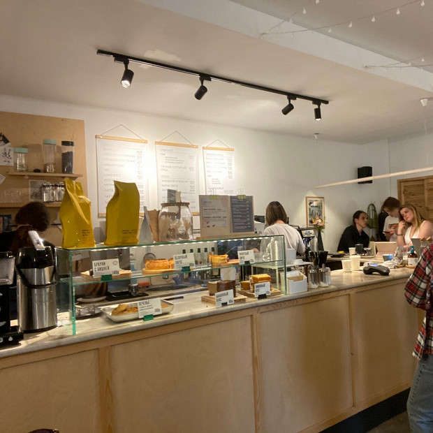 Не просто кофе, а отличный — и классика, и авторские вариации вроде латте «Черничный йогурт», раф «Теплый клетчатый плед», «Заводной апельсин» (напиток на апельсиновом фреше с эспрессо). Лучший способ получить «все и сразу» — заказать бариста-сет из эспрессо и капучино. К кофе прилагаются простой, светлый интерьер в берлинском стиле и небольшой ассортимент выпечки, особенно хорош местный лимонный кекс.