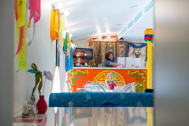 Сирафима (так!) и Евгений познакомились на строительстве Богучанской ГЭС. Сирафима из Бурятии, из Баргузинского района. Евгений — из Бугуруслана, гидротехник. В девяностых на строительстве стало совсем плохо: «Я тогда уже лесом занимался, китайцам продавал, — рассказывает Евгений. — Но все равно было уже безнадежно. Мы же молодые мужики туда приехали — гидротехники, плотники, строители. И что — спиваться, вешаться, стреляться?» Приехали однажды в отпуск в Сергиев Посад: однокурсники Евгения работали здесь на строительстве Загорской ГАЭС, гидроэлектростанции, которая использует дешевую ночную электроэнергию для закачки воды в резервуары и таким образом выравнивает суточную нагрузку энергосистемы. Потом они переехали сюда насовсем. Евгений стал работать на ГАЭС, потом занялся бизнесом, и вот в 2015 году открылась буузная (до этого открылась буузная в этнопарке «Кочевник» недалеко от Хотьково).