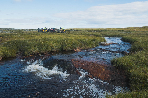 На чистом небе редкие пухлые облака, перед нами тундра, вдалеке небольшие озера невероятно ясного синего цвета. Делимся на команды, пересаживаемся на квадроциклы и разъезжаемся на разным озерам. Я иду пешком — не хочется пропустить красивые пейзажные кадры. Через 20 минут я почти по колено в болоте. Мимо едет Андрей Каменев, он тоже перемещается между озерами в поисках лучших кадров. Он помогает мне вылезти из топи и подвозит до ближайшего озера. По дороге мы роняем его рюкзак с техникой прямо в воду, но легендарный фотограф National Geographic невозмутим и, кажется, готов ко всему: рюкзак герметичный и непромокаемый, техника в порядке.
