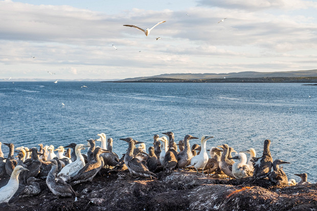 Черные точки, мельтешащие над мысом на краю острова, приобретают все более четкие очертания, они хаотично перемещаются, а в воздухе стоит грубый гомон. Это птицы. Их так много, что издали они напоминают рой мошек, летящих к фонарю.