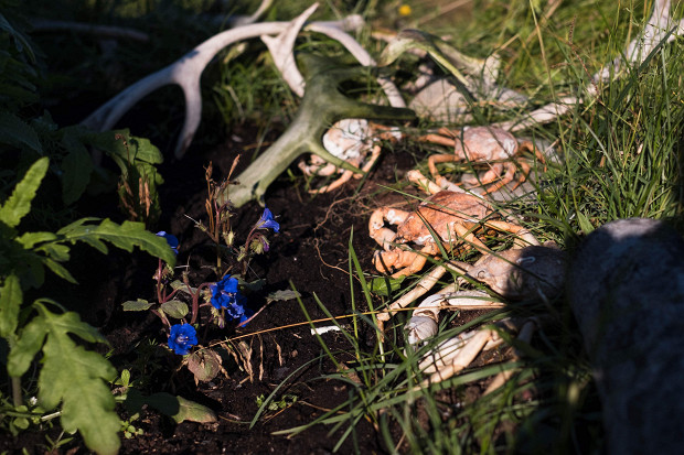 Наконец мы выгружаемся на берег. Я ищу глазами тропинку, но быстро понимаю, что тут их нет. Алексей в своих кроксах на босу ногу забирается на скалы так ловко, словно ему двадцать лет, а не шестьдесят. Я в резиновых сапогах неуклюже спешу за ним. «Щавель!» — слышу я крик Игоря. Поднимаюсь на плато, и правда — остров покрыт высокой травой, но если ее раздвинуть, то у основания можно увидеть сочные островки зеленого щавеля.