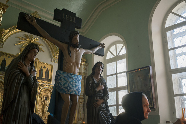 «Здесь живут тридцать восемь матушек. Молитвенное делание — ежеминутное, — сказала наш гид. — Пройдемте со мной, и вы увидите то, что я вам покажу». Мы вошли в монастырь и увидели то, что она нам показала: церковь, хоздвор, кельи, беседку для бесед с верующими. В храме шла служба, и все было наполнено пением. На скамейках сидели монахини в высоких клобуках, они ожидали своей очереди исповедоваться. Священник принимал исповеди позади главного сокровища Перевозного — поразительного образца пермской деревянной скульптуры под названием «Голгофа».