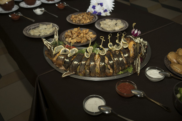 Удмуртские перепечи — корзиночки с начинкой, основа которой — молочно-яичная, а дополнения могут быть самыми разными; в данном случае с луком и яйцом. Кыстыбеи — так здесь называют татарские кыстыбыи, сложенные пополам лепешки с начинкой, тут — из ржаной муки, с пшенной кашей и грибами. Перемячи — татарские жареные ватрушки с мясом, прообраз русских беляшей. Кокроки — удмуртские жареные пирожки из пресного теста, в «Нечкино» их сделали с капустой и с яблоками. Фаршированная щука, уха на курином бульоне и котлеты из четырех видов рыб — как образец прикамской кухни. Это все сделал Алексей.