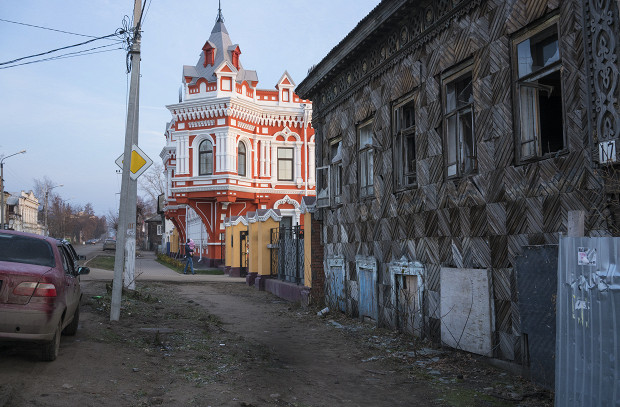 Мы прошлись по пустым ноябрьским улицам, оценили былое богатство и архитектурные вкусы прикамского купечества, поговорили о судьбе центральных улиц тех малых и средних городов, которые расширила советская индустриализация. Молодые жители предпочитали новые дома со всеми удобствами и покидали историческую, но устаревшую в коммунальном плане застройку, и та приходила в небрежение. Существующие в ней учреждения и магазины также не имели, да и не имеют в своих бюджетах строки о сохранении исторического облика зданий. Точнее, именно исторический облик в них и сохраняется — ветшающий, синхронизированный с текущим, как тяжелая река, временем. Незадолго до этого мы проезжали по многоэтажным сарапульским улицам — там было много огней, машин, людей; здесь же была холодная тишина.