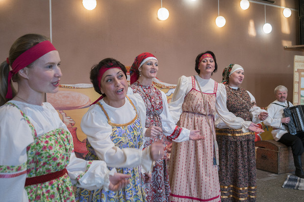 Там, под голубым панно, изображающим счастливую сельскую юность семидесятых (обратите внимание на самую первую фотографию), нам накрыли щедрый стол. Солено-кислые огурцы, слабосоленая капуста целыми кочанами, расчудесные маринованные помидоры и опята, большие мягкие шаньги с яйцом и картошкой, совершенно роскошное копченое сало, с очень легкой кислинкой и столь же легкой сладостью квас — и еще отчетливый самогон из хлебной браги, выдержанный в дубовой бочке. Все это можно найти во многих российских местах, от юга до севера. И все это специалитеты — несмотря на широчайшее географическое распространение, так что зачем выдумывать что-то небывало локальное, если вот оно и есть: осенняя стопка самогона под крепкий соленый огурец с ароматами укропа и хрена и отлично сделанное сало.
