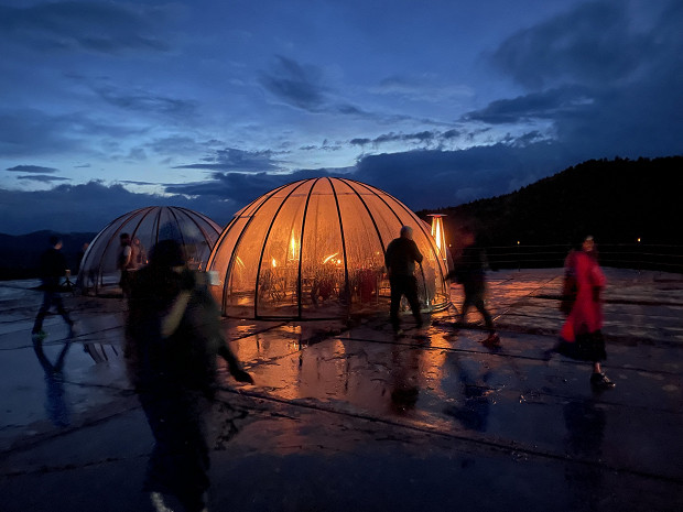 «Дорогие гости, прошу на время освободить столы, мы поставим на них купола — на нас надвигается буря», — говорит в разгар заключительного «Дикого ужина» хозяин мероприятия, шеф-повар Хайям Аминов. И правда, блиставшее сквозь верхушки сосен закатное солнце внезапно сменяется рваными грозовыми облаками, готовыми вот-вот разразиться дождем. Сибирский климат даже в разгар лета непредсказуем, поэтому в приглашениях и пресс-релизах фестиваля специально обозначено, что «ужин состоится в любую погоду». Чего это стоило организаторам, остается только догадываться.