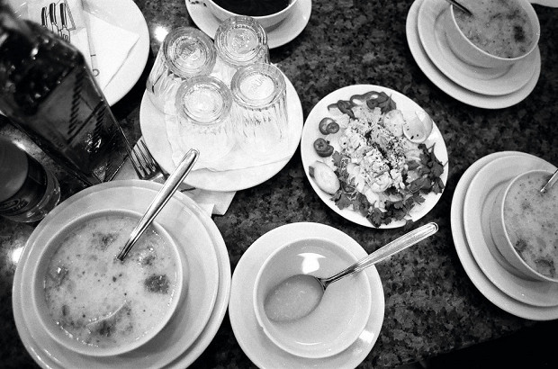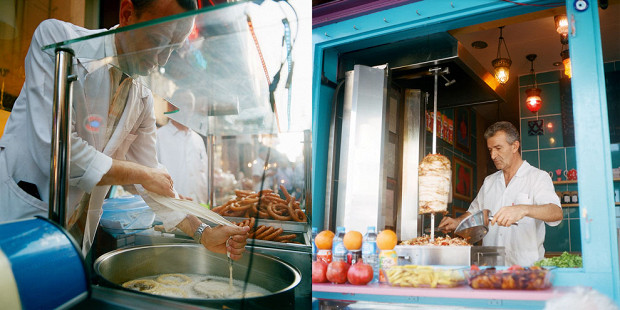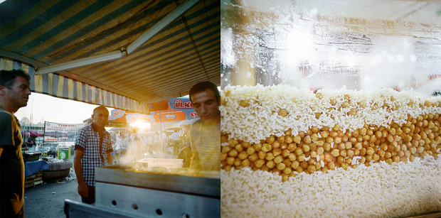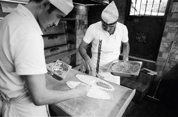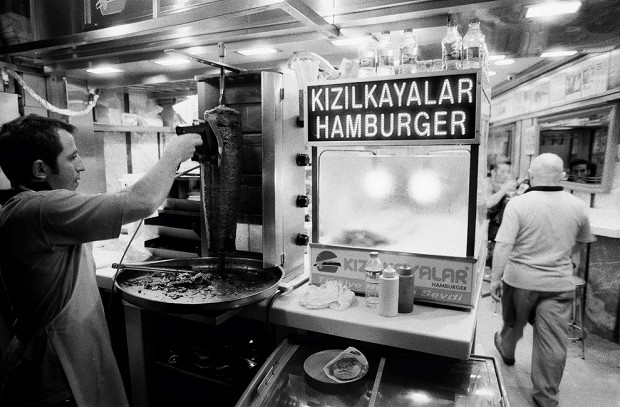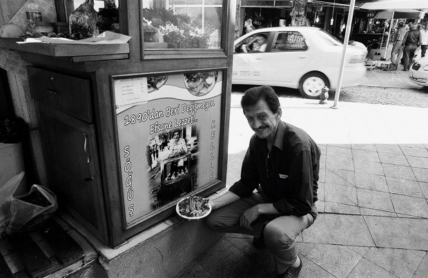 Пиде — лодочки из хрустящего теста с разными фаршами, от сыра со шпинатом и яйцом до мяса с травами, а лучшее место, удивительно, тоже называется Karadeniz, и там только пиде и делают. Пока наши пекутся в огромной печи, я иду прогуляться, заворачиваю за угол и вижу человек пять вокруг небольшого гриля, на котором прямо на тротуаре жарят кёфте. Я зову фотографа Пустовалова, он прицеливается своим сорокалетним «роллейфлексом», а самый главный жарщик, видя такое фотографическое уважение, раздает нам по булке с пылающими котлетками внутри.