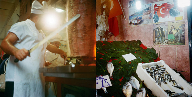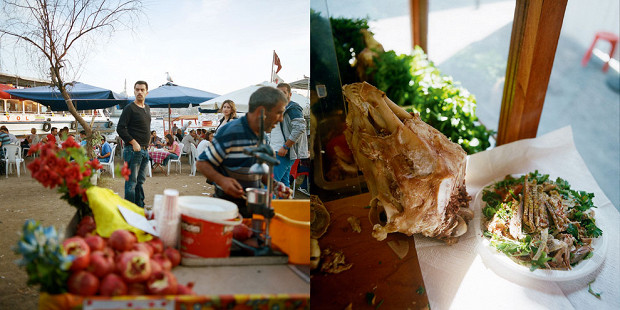 «А это вот чёкелек, — говорит Экин, когда перед нами ставят тарелку с оранжевой икристой россыпью, пересыпанной пряностями и залитой оливковым маслом, — особо приготовленный свежий козий сыр, это обязательная бесплатная закуска, его надо есть с хлебом, а с каким — сам сейчас увидишь». И приносят горячий, надутый воздухом, как дирижабль, тончайший, как оказывается, хлеб, обсыпанный кунжутом. Вслед за ним — напитанный фисташками нежнейший кебаб и лахмаджун — это, чтобы вы знали, если не знаете, тонкая лепешка со столь же тонким слоем мясного фарша, сверху которого накидана петрушка, — все нужно сбрызнуть лимоном, свернуть в рулет, немедленно съесть. Под вечер мы оказываемся на рыбном рынке у Галатского моста, где хлещут из таза водой на лежащее серебро и громко его продают, сбавляя цену, потому что время к закрытию. Глаза хотят свежей хамсы, которую возьмут с прилавка и при тебе пожарят, но нет, мы уже не можем есть.