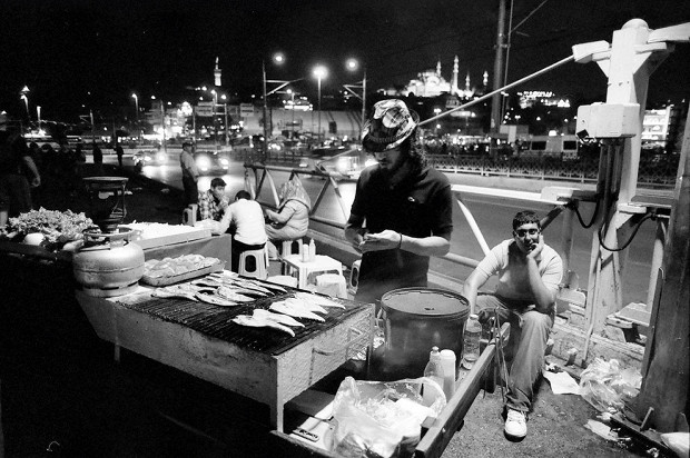 Вот, например, так хочется балык-экмек, что черт возьми. Балык-экмек — это вот что такое: половинка скумбрии, при тебе поджаренная и сунутая в располовиненную булку со свежим луком и зеленью. Обычное дело — взять его в павильоне на пристани Эминёню: издалека слышно, как зазывают к нему «Буйрун-буйрун-буйрун!» (пожалуйста, то есть, пожалуйста), и толпа толпится, насыщаясь, — но сейчас павильон закрыт. Потому поднимаемся на Галатский мост и берем первый попавшийся — у парня, который не слишком заморачивается, чуть прожарил тушку — и все, разрезал булку — и все, кинул зелени — и все, и иди себе дальше, человек. Но даже пусть такой — садишься на бордюр ровно посередине Золотого Рога, и сзади тянутся длинные трамваи, а впереди светится Азия, тросы Босфорского моста, ловкие, как автобусы, паромы, кончики удочек, которыми заставлен мост, а под удочками стоят стаканчики с букетами остроносой рыбьей мелюзги-наживки. И смотришь на чайку в темном небе, пойманную зеленым лазерным лучом прохожего, и посмеиваешься над старым трюком чистильщика обуви, который как будто теряет перед тобой щетку и идет себе дальше, прислушиваясь, когда его окликнут, чтобы развернуть свое искусство убеждения, норовя ненароком мазнуть ваксой серые кроссовки, которые непременно, непременно, my friend, нужно почистить, — ничего, что кроссовки серые, и ничего, что ваксой.