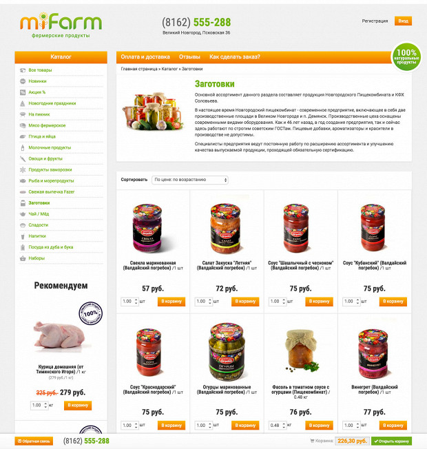 онлайн-продаж, а летом 2016 года открыл точку на Псковской. Овощи, фрукты и мясо от новгородских фермеров соседствуют с промышленной выпечкой, копченые судаки — с замороженными котлетами из трески, дробленый крыжовник с сахаром из крестьянского хозяйства Соловьева А.М. — с маринованными помидорами Валдайского консервного завода. А еще есть травяные чаи, мед, сывороточно-ягодные напитки, козьи и коровьи сыры — и холынские соленые огурцы. Это важный местный специалитет: в деревне Холынья близ Ильменя огурцы солят в деревянных бочках и опускают на дно одной из трех местных речек, где они в холоде сохраняют свои хрустящие свойства. Метод вымирающий, и не факт, что в «Мифарме» продают именно такие, но огурцы все равно холынские по происхождению. По новгородским меркам тут недешево, но, если сравнить с ценами «Лавкилавки», так все прекрасно.